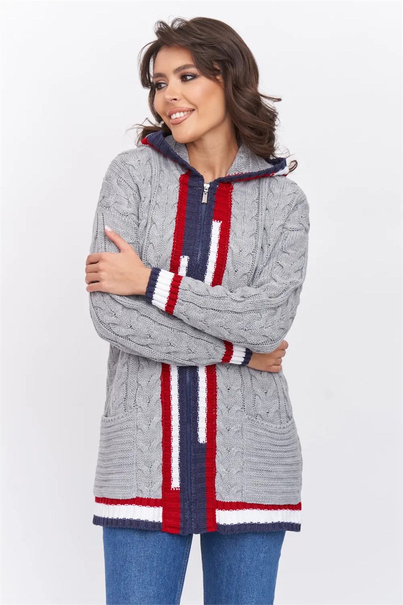 Жакет женский вязаный свободного силуэта, с капюшоном. Спущеное плечо, рукав длинный. По низу рукава и изделия эластичная резинка. Жакет выполнен вязкой с объемными косами. Жакет декорирован контрастными полосами на капюшоне, манжетах и вдоль полочек. Оптимальный состав - пан-70%, шерсть - 30% - позволяет чувствовать себя комфортно в помещении. Жакет, благодаря свободному крою, подойдет для любого типа фигуры.