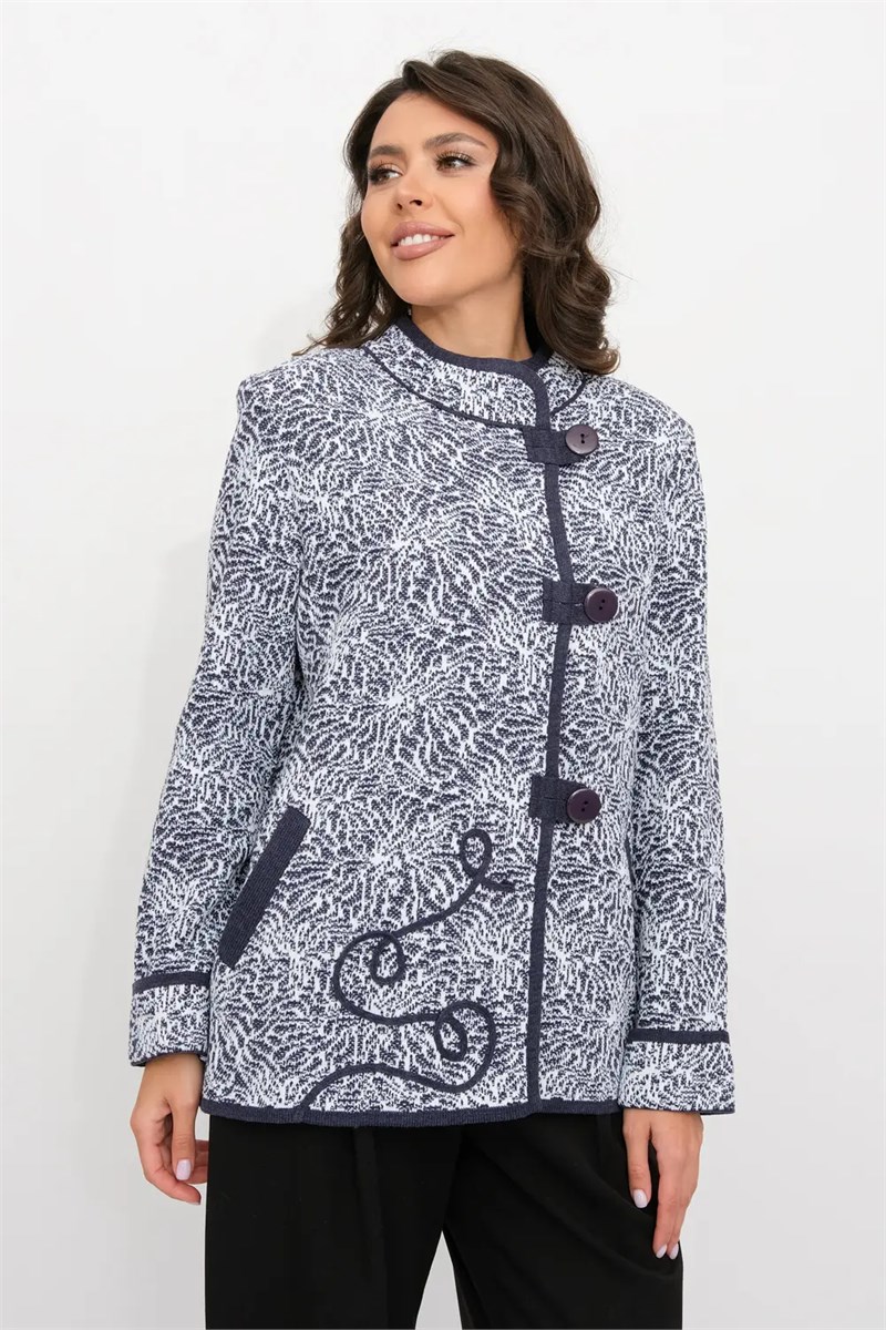 Вязаный женский жакет свободнного силуэта с воротником-стойкой. Рукава втачные длинные с отворотом. Жакет застегивается на пуговицы и воздушные петли. Два боковых прорезных кармана с листочкой. Жакет выполнен жаккардовым структурным переплетением. На правой полочке внизу расположена декоративная аппликация.