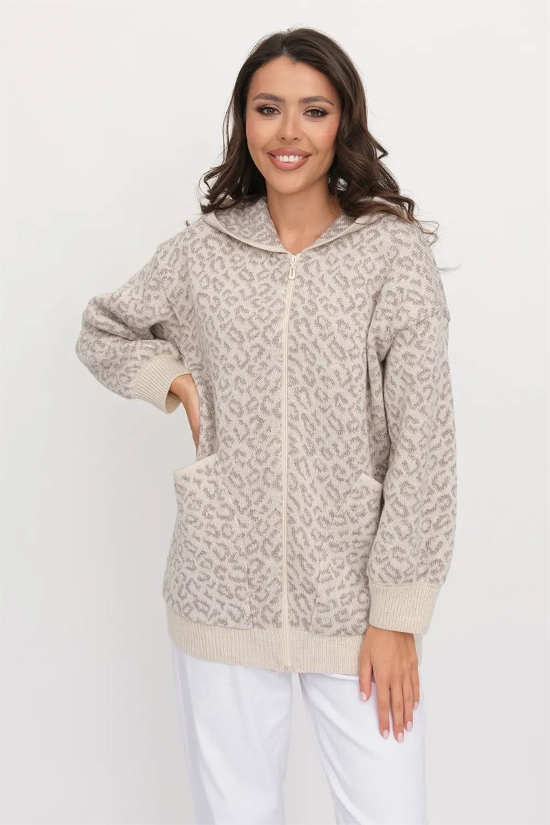 Жакет свободного силуэта на молнии с капюшоном. Два накладных кармана по бокам изделия. Рукава втачные длинные, плечо спущенное. Низ изделия и низ рукавов вывязан эластичным переплетением. Жакет выполнен жаккардовым переплетением, образующим анималистический рисунок.