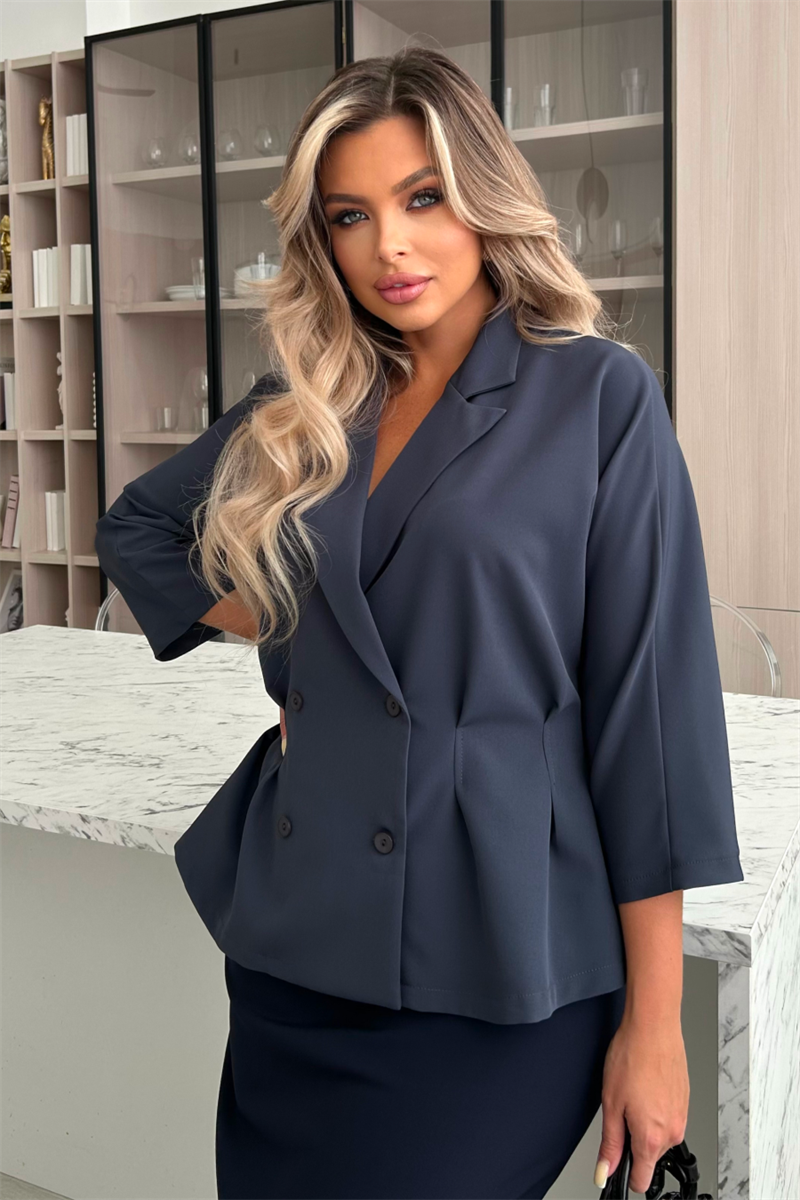 Комфортный жакет приталенного силуэта выполнен из легкой костюмной ткани. Цельнокроенный рукав длиной 7/8. Английский отложной воротник. Двубортная застежка на петли и пуговицы. По линии талии застрочены складки. Низ ровный, без разрезов. Рекомендуемая стирка при t не более 30°. Длина жакета: 59 см Длина рукава от горловины: 58 см Рост фотомодели: 168 см Размер фотомодели: 42 Ткань: Костюмная