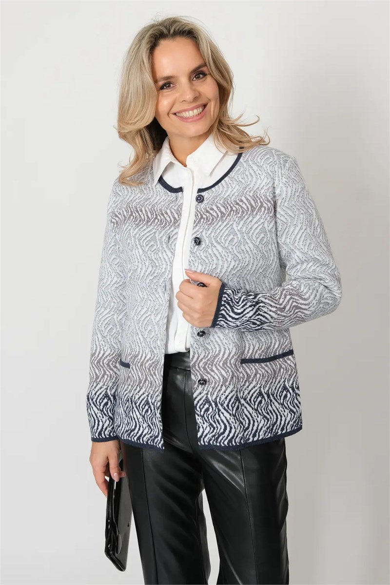 Женский жакет полуприлегающего силуэта с круглой горловиной. Рукава втачные длинные. Жакет застегивается на пуговицы, два накладных кармана. Жакет выполнен жаккардовым переплетением. По низу изделия и рукавов, горловине и входу в карман проходит отделка контрастного цвета.