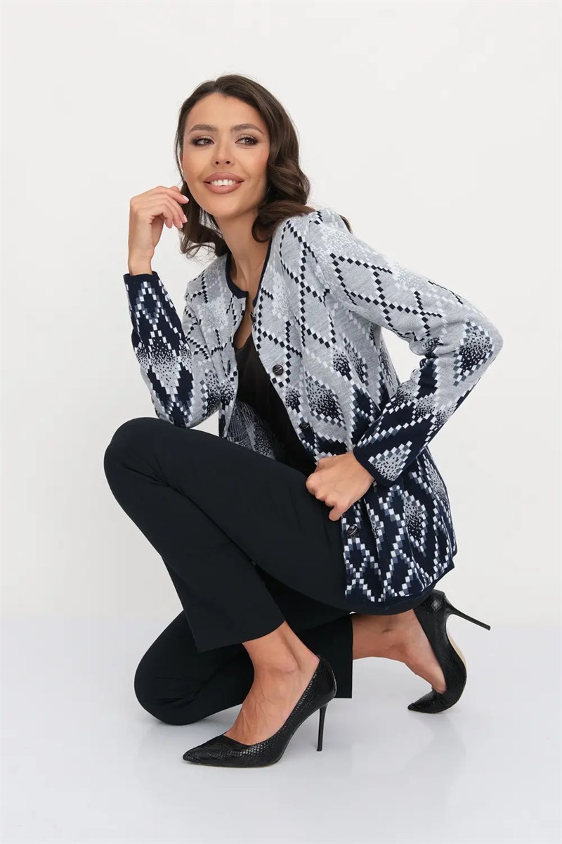 Женский трикотажный жакет полуприлегающего силуэта. Рукава втачные длинные. Жакет застегивается на пуговицы, горловина круглая. Два накладных кармана квадратной формы. Изделие выполнено жаккардовым переплетние образующим геометрический рисунок с цветовым переходом от светлого к темному.