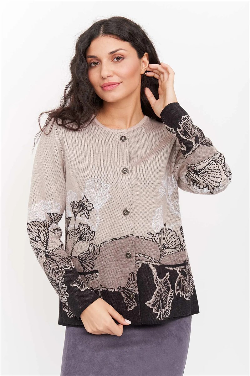 Женский трикотажный жакет полуприлегающего силуэта. Рукава втачные длинные. Жакет застегивается на пуговицы, горловина круглая. Два накладных кармана. Изделие выполнено жаккардовым переплетние образующимрастительный рисунок.