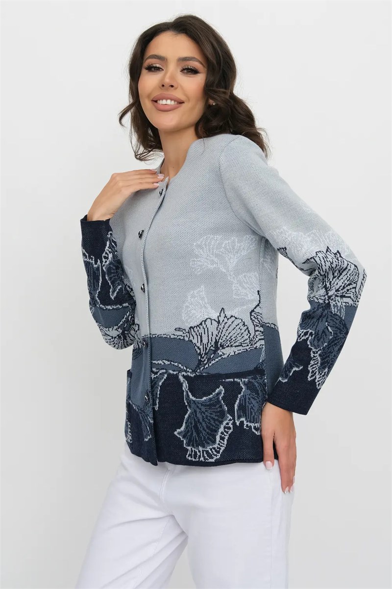 Женский трикотажный жакет полуприлегающего силуэта. Рукава втачные длинные. Жакет застегивается на пуговицы, горловина круглая. Два прорезных кармана. Изделие выполнено жаккардовым переплетние образующим геометрический рисунок "ромб"