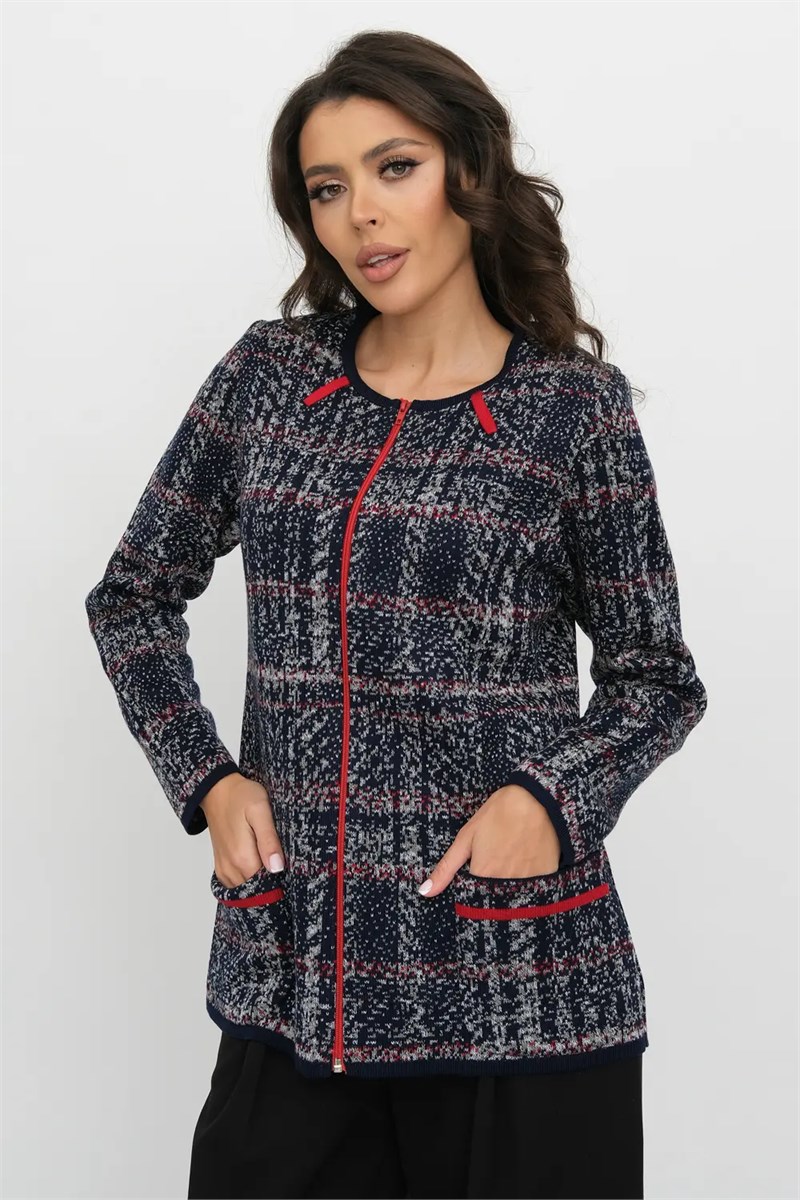 Женский жакет на молнии полуприлегающего силуэта. Горловина круглая обработана контрастной бейкой. Длинный втачной рукав, накладные карманы. Жакет выполнен жаккардовым переплетением с классическим узором клетка с добавлением акцентных красных деталей. Жакет очень комфортный, прекрасно садится на любой тип фигуры. Отличный как повседневный. так и деловой вариант.