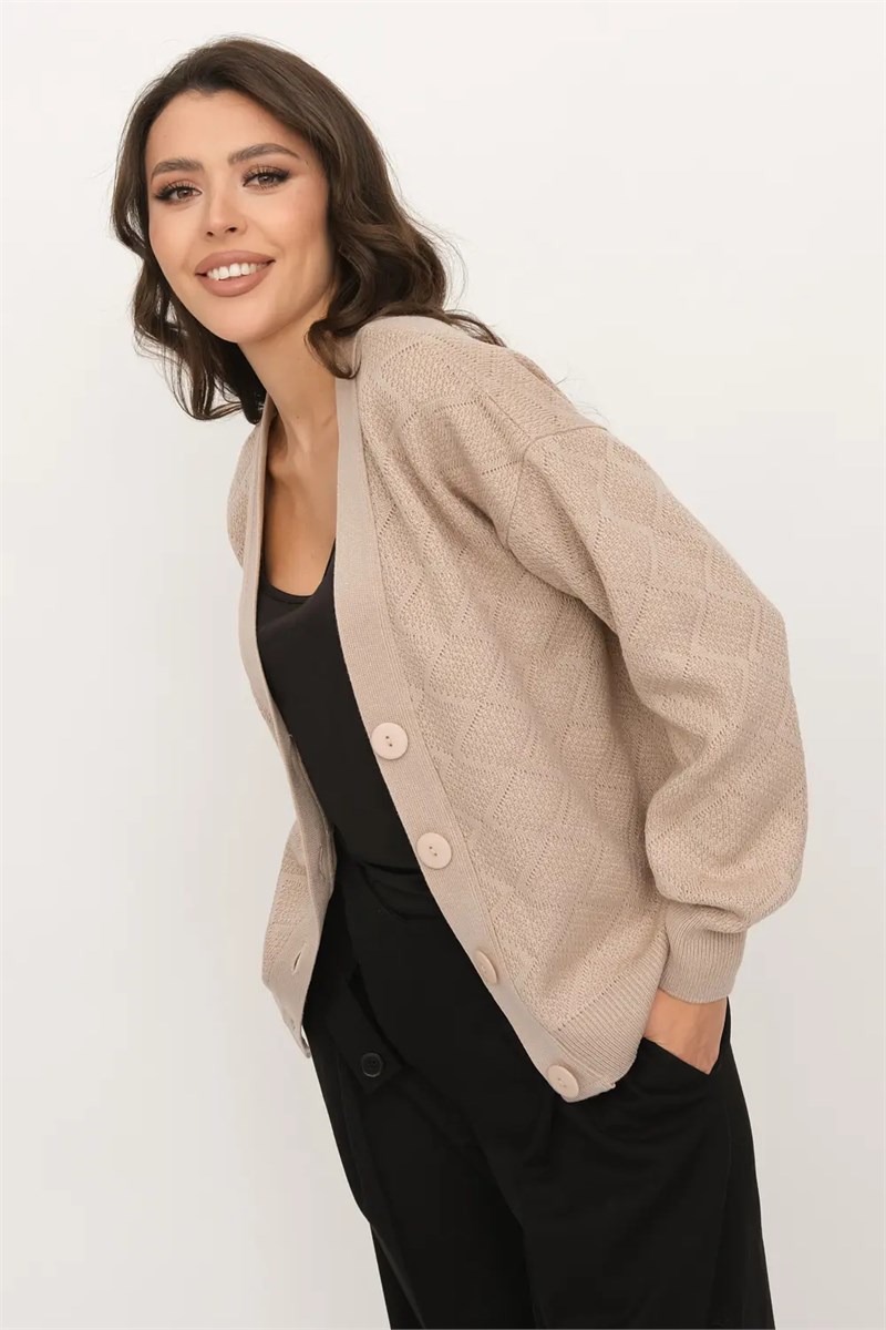 Удлиненный женский трикотажный жакет на пуговицах, V-образный вырез горловины. Плечо спущенное, рукава втачные длинные на эластичной манжете. Жакеты выполнен накладным жаккардовым переплетением образующим рельефный рисунок Планка выполнена формоустойчивым переплетением.