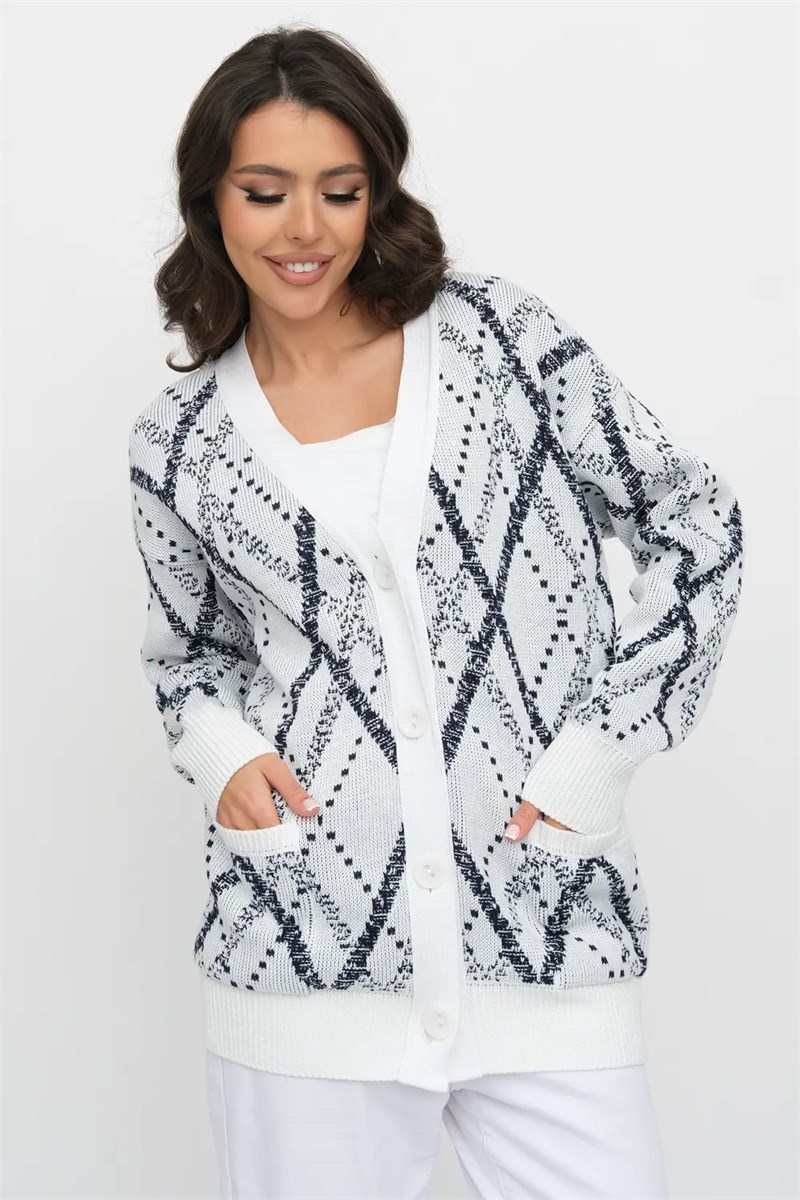 Жакет свободного силуэта. Рукав длинный реглан с эластичной манжетой. Кардиган застегивается на пуговицы и заканчивается эластичным переплетением. Жакет имеет V-образную горловину. Перед и полочки выполнены одноцветным переплетением чередованием лицевых и изнаночных петель, образующим рисунок "рис". Рукава выполнены гладким одноцветным переплетением. По полочкам и горловине проходит планка .