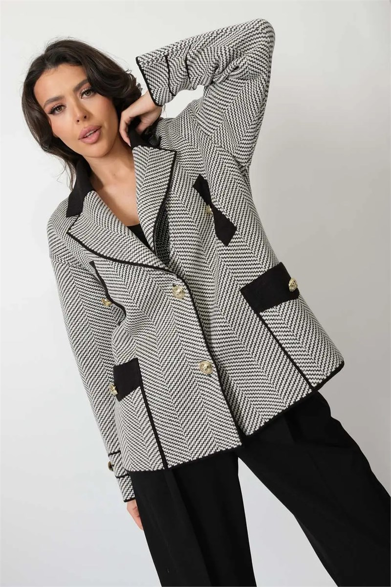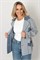 Удлиненный женский трикотажный жакет на пуговицах свободного силуэта. V-образный вырез горловины, воротник классический отложной. Плечо спущеное, рукава втачные длинные, два больших накладных кармана. Жакет выполнен жаккардовым переплетением, образующим рисунок-ёлочка.