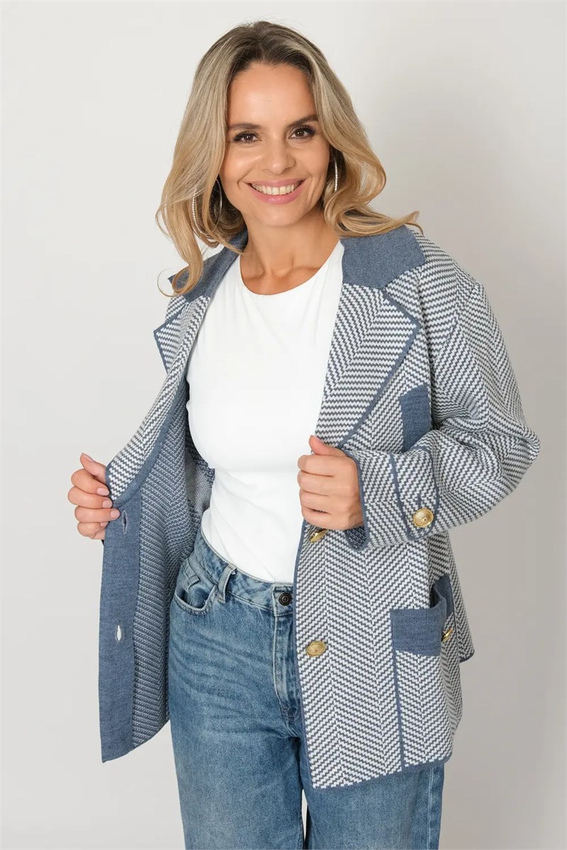 Удлиненный женский трикотажный жакет на пуговицах свободного силуэта. V-образный вырез горловины, воротник классический отложной. Плечо спущеное, рукава втачные длинные, два больших накладных кармана. Жакет выполнен жаккардовым переплетением, образующим рисунок-"ёлочка".