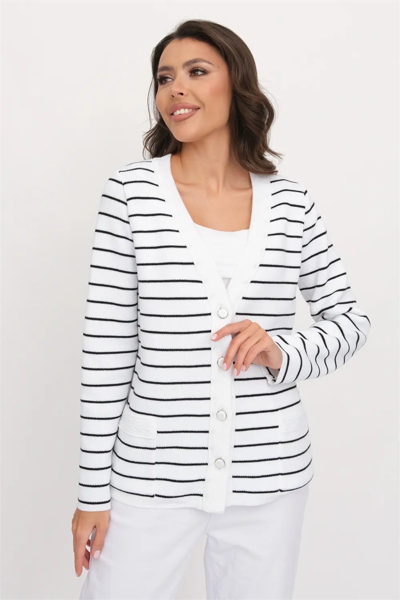 Молодежный жакет свободного силуэта в тонкую горизонтальную полоску контрастного черного цвета. Ворот изделия, передняя планка и края карманов отделаны однотонной белой бейкой. Плечо спущенное, рукава втачные длинные. Жакет застегивается на пуговицы, образуя V-образный вырез горловины.