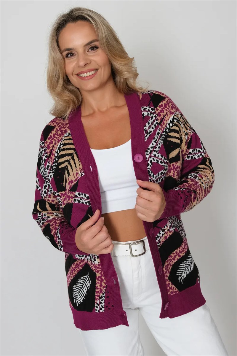 Вязаный женский жакет свободного силуэта, оверсайз. Плечо спущенное, рукава втачные длинные. Жакет застегивается на пуговицы, образуя V-образный вырез горловины. Жакет выполнен жаккардовым переплетением, рисунок растительный абстрактный. Низ изделия и манжеты выполнены эластичным переплетением.