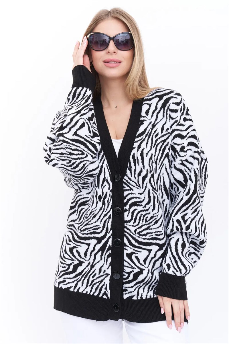 Вязаный женский жакет свободного силуэта. Плечо спущенное, рукава втачные длинные. Жакет застегивается на пуговицы, образуя V-образный вырез горловины. Жакет выполнен жаккардовым переплетением с анималистическим рисунком. Низ изделия и манжеты выполнены эластичным переплетением.