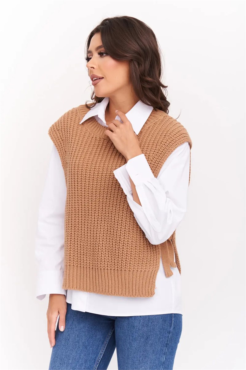Оригинальный жилет прямого кроя. Круглая горловина с широкой эластичной резинкой, плечо спущенное. Удлиненная спинка, которая соединяется с передом по бокам трикотажными лентами, Можно надевать в офис и школу поверх блуз, очень практичный в использовании.